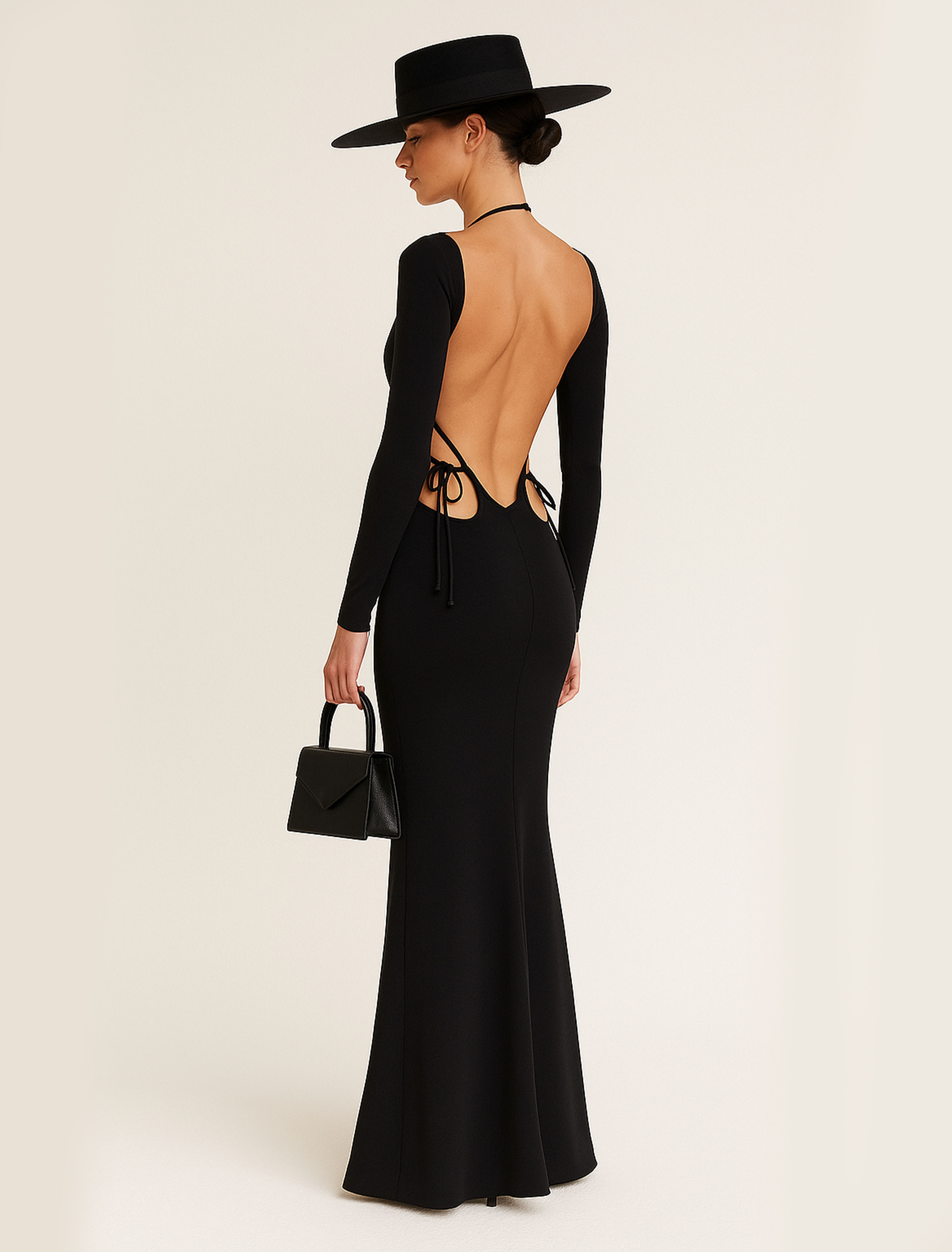 Featuring a deep bikini-style neckline, bold front cutouts, and fitted long sleeves, this piece blends sensuality and sophistication while elongating the silhouette with its flowing skirt.