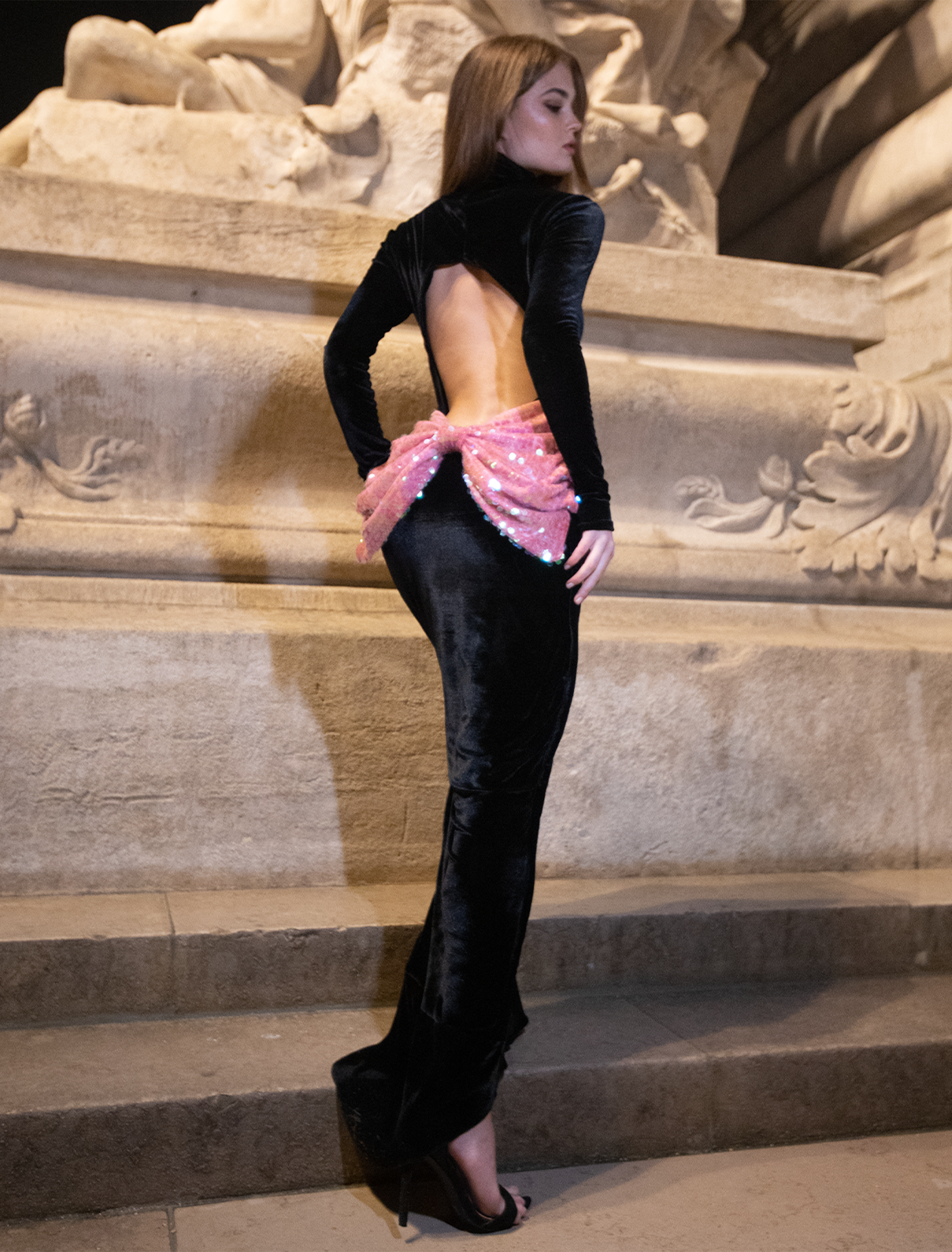 With its sophisticated design, this velvet dress becomes a true icon of elegance, offering a flawless fit that enhances the feminine silhouette.The strategic cut-out design with a fully open back, finished with a charming bow detail, creates a modern, sensual, and elegant aesthetic — perfect for women who wish to stand out with authenticity and style. Every detail has been carefully crafted to highlight feminine beauty in a timeless and graceful way.
